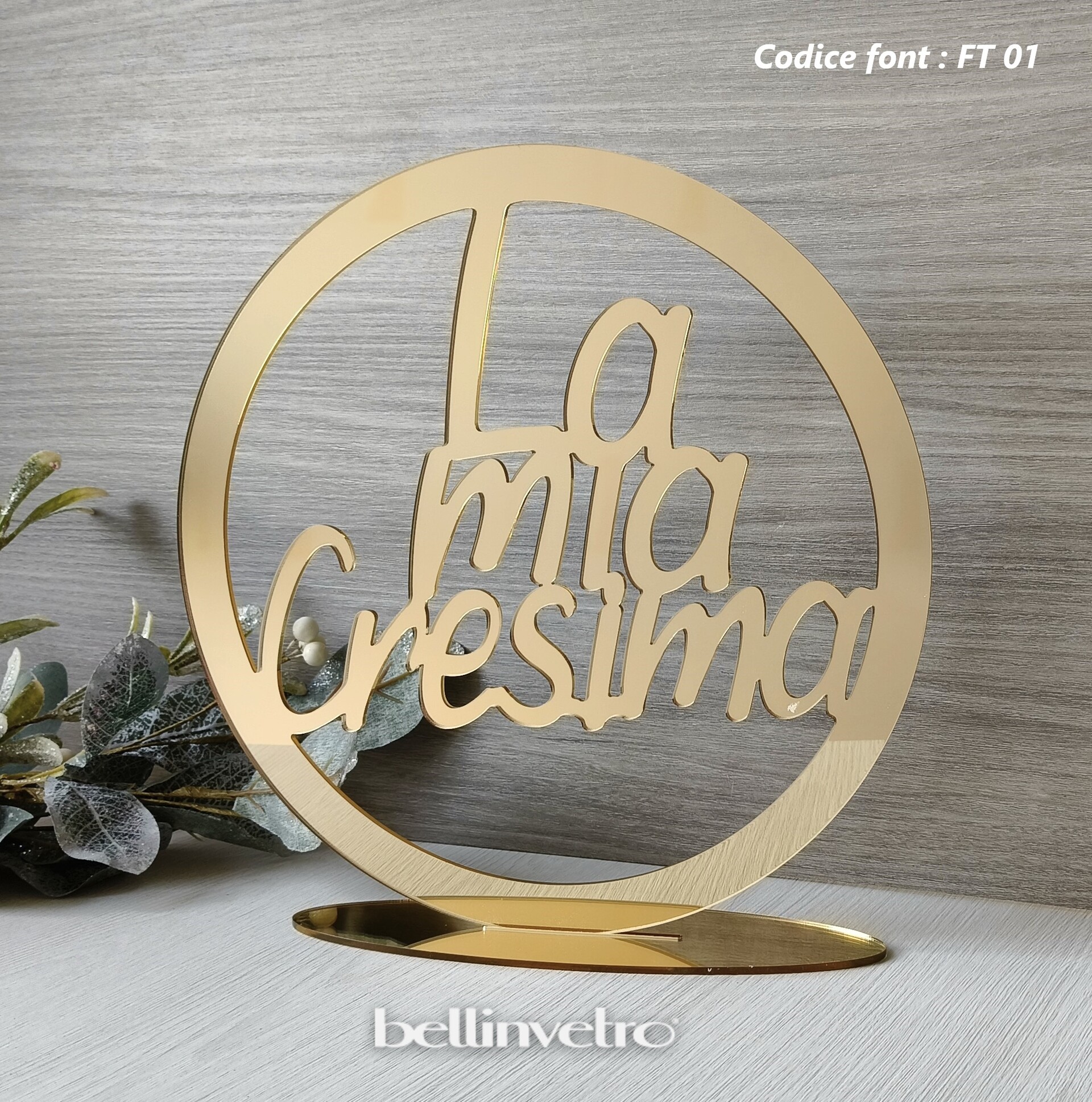 Il cerchio con scritta "La Mia Cresima" in stile moderno è uno splendido oggetto di design realizzabile in Plexiglass.